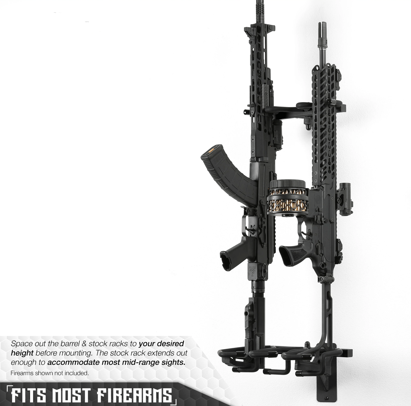 Space-Saving Design for Tight Areas: When every inch counts, this compact, adjustable gun rack lets you fit your firearms into small spaces like gun closets, behind doors, or above workbenches. It’s the ideal solution for gun room walls and tactical displays where flexibility is key.
